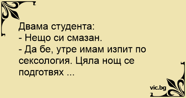 - Да бе, утре имам изпит по сексология. Цяла нощ се подготвях ...