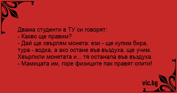 - Дай ще хвърлям монета: ези - ще купим бира, тура - водка, а ако остане във въздуха, ще учим.