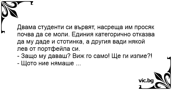 Двама студенти си вървят, насреща им просяк почва да се моли. Единия категорично отказва да му даде и стотинка, а другия вади някой лев от портфейла си.