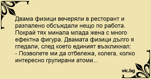 Двама физици вечеряли в ресторант и разпалено обсъждали нещо по работа. Покрай тях минала млада жена с много ефектна фигура. Двамата физици дълго я гледали, след което единият възкликнал: