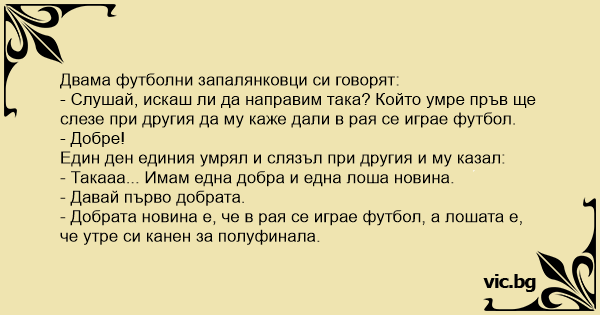 - Слушай, искаш ли да направим така? Който умре пръв ще слезе при другия да му каже дали в рая се играе футбол.