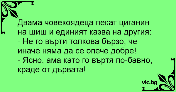 Двама човекоядеца пекат циганин на шиш и единият казва на другия: