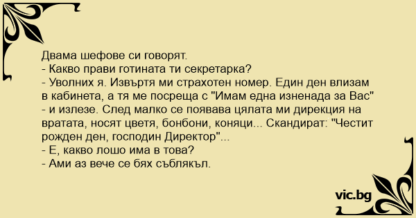 - Уволних я. Извъртя ми страхотен номер. Един ден влизам в кабинета, а тя ме посреща с "Имам една изненада за Вас" - и излезе. След малко се появава цялата ми дирекция на вратата, носят цветя, бонбони, коняци... Скандират: "Честит рожден ден, господин Директор"...