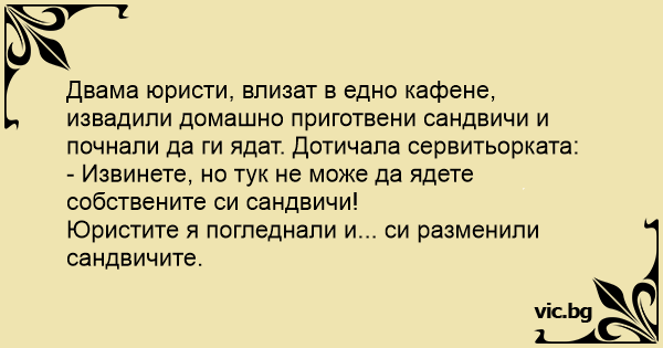 Két ügyvéd bemegy egy étterembe, leülnek, kérnek egy pohár vizet, majd kinyitják az aktatáskájukat és elővesznek 1-1 szendvicset. A pincér felháborodva odaszól: - De uraim! Ez egy étterem! Itt nem...