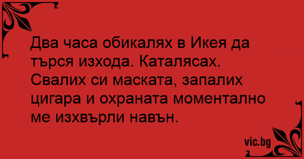 Два часа обикалях в Икея да търся изхода. Каталясах. Свалих си маската, запалих цигара и охраната моментално ме изхвърли навън.