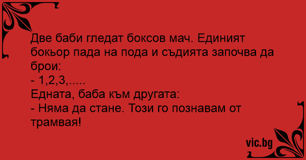 Две баби гледат боксов мач. Единият бокьор пада на пода и съдията започва да брои: