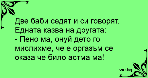 2 баби - Пено, Пеноо, това дето го мислехме за оргазъм се оказа астма... Жоре, как е с новото гадже? Жена излиза от кабинета на лекаря и казва на мъжа си: - Скъпи, това дето го мислехме за оргазъм, се оказа астма... Што е илузија? - Кога после 25 години брак ке забележиш дека жена ти не е страствена, него има астма. Je pensais être un amant exceptionnel, jusqu'au jour où j'ai appris qu'elle avait de l'asthme.
