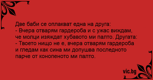- Вчера отварям гардероба и с ужас виждам, че молци изяждат хубавото ми палто. Другата:
