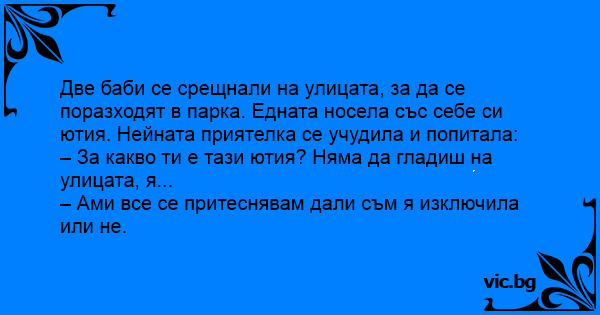 Две баби се срещнали на улицата, за да се поразходят в парка. Едната носела със себе си ютия. Нейната приятелка се учудила и попитала:
