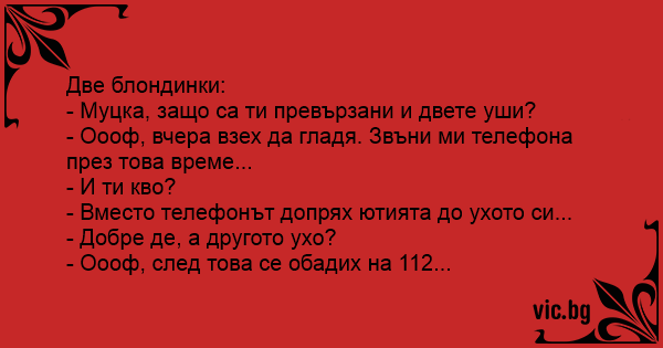Білявка з обпеченими вухами приходить до лікаря. — Що трапилось? — запитує лікар. — Переглядала по телевізору серіал, праску вимкнути забула, а вона, як на зло, стояла поряд із телефоном. Коли...