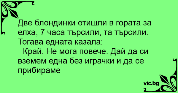 Doua blonde Hotarasc sa mearga in padure sa-si Caute un brad de Craciun. Dupa cateva ore de Cautare, una dintre ele ii spune celeilalte: - Asa Nu mai merge! Eu propun sa luam primul brad pe care il...
