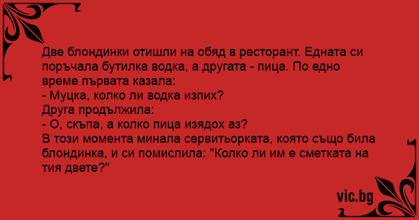 Две блондинки отишли на обяд в ресторант. Едната си поръчала бутилка водка, а другата - пица. По едно време първата казала: