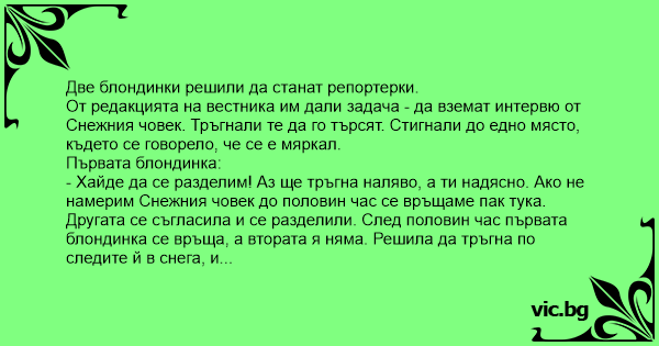 Другата се съгласила и се разделили. След половин час първата блондинка се връща, а втората я няма. Решила да тръгна по следите й в снега, и да я намери. Тръгнала тя, вървяла, вървяла и изведнъж гледа - в снега се търкаля диктофонът й. Включила го да чуе последно, какво е записала, а от там се чува гласът на втората блондинка: