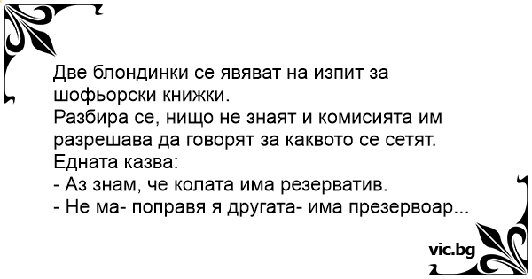 Две блондинки се явяват на изпит за шофьорски книжки.