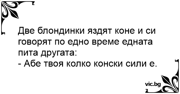 Две блондинки яздят коне и си говорят по едно време едната пита другата: