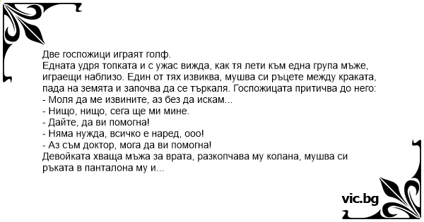 Golfo klubas. Dvi moterys žaidžia golfą. Viena kad užsimos, kad smogs, o kamuoliukas nuskrenda ir pataiko į vieną vyrą. Tas susilenkia, susiima Už tarpukojo ir nukrenta ant žemės. Moteris pribėga...