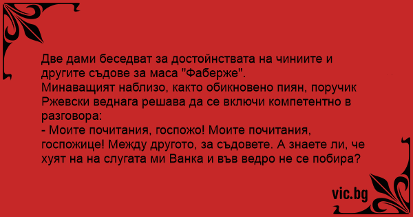 - Моите почитания, госпожо! Моите почитания, госпожице! Между другото, за съдовете. А знаете ли, че хуяt на на слугата ми Ванка и във ведро не се побира?