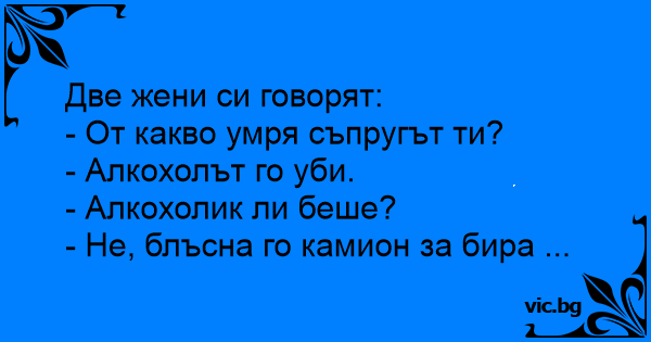 2 damer står og snakker: "Hvad døde din mand af?" "Alkoholen blev hans død." "Nå, var han alkoholiker?" "Nej, han blev kørt ned af en ølbil..."