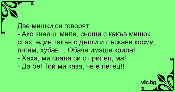 - Ако знаеш, мила, снощи с какъв мишок спах: един такъв с дълги и лъскави косми, голям, хубав… Обаче имаше крила!