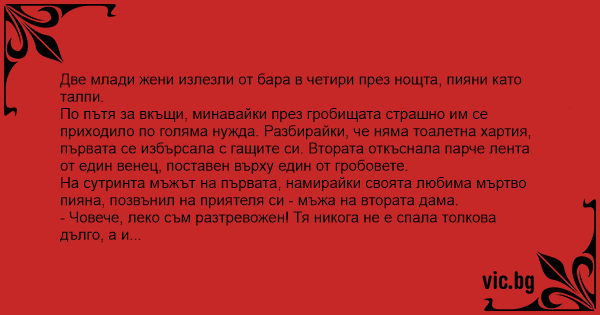 По пътя за вкъщи, минавайки през гробищата страшно им се приходило по голяма нужда. Разбирайки, че няма тоалетна хартия, първата се избърсала с гащите си. Втората откъснала парче лента от един венец, поставен върху един от гробовете.