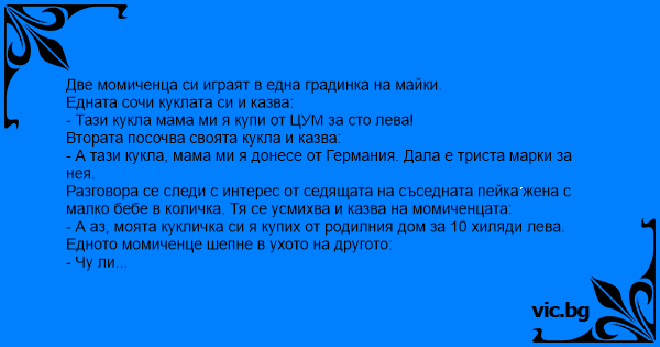 Две момиченца си играят в една градинка на майки. Едната сочи куклата си и казва: - Тази кукла мама ми я купи от ЦУМ за сто лева! Втората посочва своята кукла и казва: - А тази кукла, мама ми я донесе от Германия. Дала е триста марки за нея. Разговора се следи с интерес от седящата на съседната пейка жена с малко бебе в количка. Тя се усмихва и казва на момиченцата: - А аз, моята кукличка си я купих от родилния дом за 10 хиляди лева. Едното момиченце шепне в ухото на другото: - Чу ли я тая .. колко пари е дала на някой да я изчука?