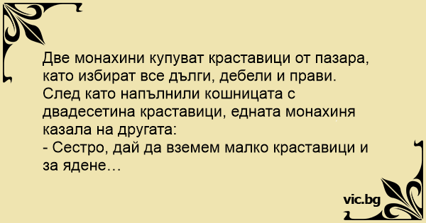 След като напълнили кошницата с двадесетина краставици, едната монахиня казала на другата: