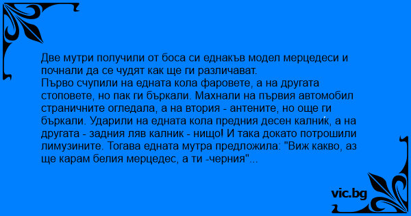 Първо счупили на едната кола фаровете, а на другата стоповете, но пак ги бъркали. Махнали на първия автомобил страничните огледала, а на втория - антените, но още ги бъркали. Ударили на едната кола предния десен калник, а на другата - задния ляв калник - нищо! И така докато потрошили лимузините. Тогава едната мутра предложила: "Виж какво, аз ще карам белия мерцедес, а ти -черния"...