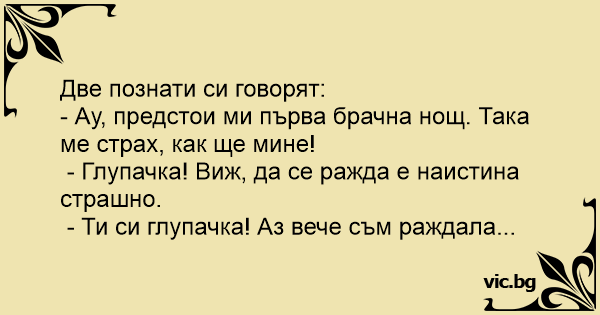 - Ау, предстои ми първа брачна нощ. Така ме страх, как ще мине!