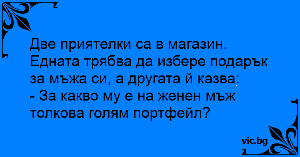 Две приятелки са в магазин. Едната трябва да избере подарък за мъжа си, а другата й казва:
