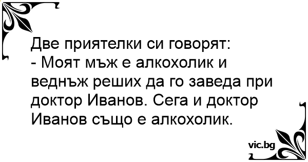 - Моят мъж е алкохолик и веднъж реших да го заведа при доктор Иванов. Сега и доктор Иванов също е алкохолик.