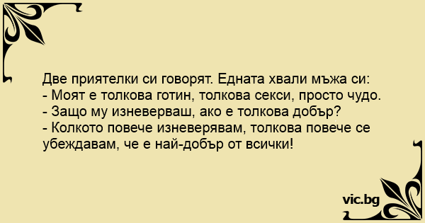 Две приятелки си говорят. Едната хвали мъжа си: