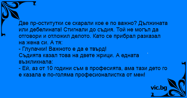 Две пpoctиtуtkи се скарали кое е по важно? Дължината или дебелината! Стигнали до съдия. Той не могъл да отговори и отложил делото. Като се прибрал разказал на жена си. А тя:
