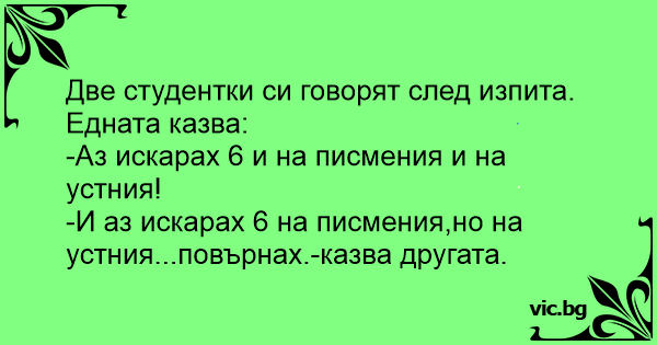 -И аз искарах 6 на писмения,но на устния...повърнах.-казва другата.