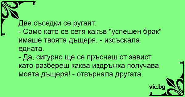 - Да, сигурно ще се пръснеш от завист като разбереш каква издръжка получава моята дъщеря! - отвърнала другата.