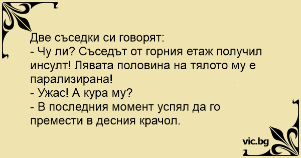 - Чу ли? Съседът от горния етаж получил инсулт! Лявата половина на тялото му е парализирана!