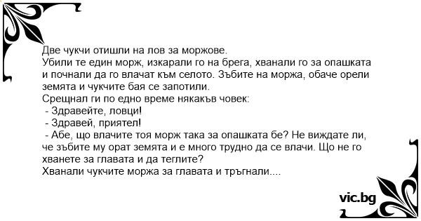 Убили те един морж, изкарали го на брега, хванали го за опашката и почнали да го влачат към селото. Зъбите на моржа, обаче орели земята и чукчите бая се запотили.