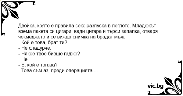 Tрпе лежи во кревет после секс, пуши цигара и се загледува во една слика на ѕидот. - Кој ти е оној ма на ѕидот - маж ? - Не. - Брат ? - Не. - Швалер ? - Не бе, јас сум, само пред операција!