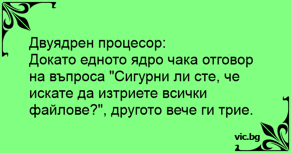 Докато едното ядро чака отговор на въпроса "Сигурни ли сте, че искате да изтриете всички файлове?", другото вече ги трие.