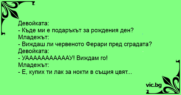 - Drágám! Vettél nekem valamit a szülinapomra? - Látod azt a piros Ferrarit, ott a járda mellett? - Jaj de gyönyörű, már nagyon vágytam rá! - Na! Egy olyan színű rúzst.