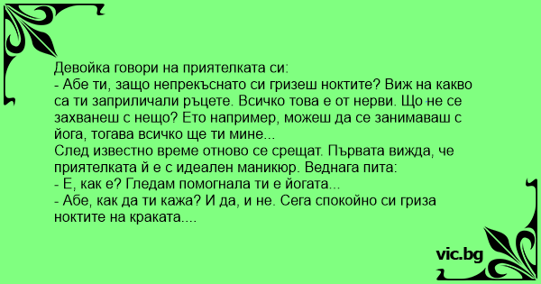 След известно време отново се срещат. Първата вижда, че приятелката й е с идеален маникюр. Веднага пита: