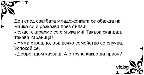 Три тижні після одруження. Дочка дзвонить матері: — Мамо, мамо, що робити, у нас сімейний скандал! — Спи спокійно, доню. Сімейні скандали — звичне явище в подружньому житті. — А що тоді з трупом...