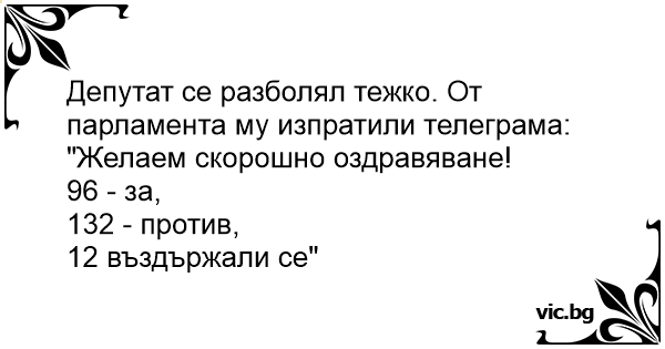 Депутат се разболял тежко. От парламента му изпратили телеграма: "Желаем скорошно оздравяване!