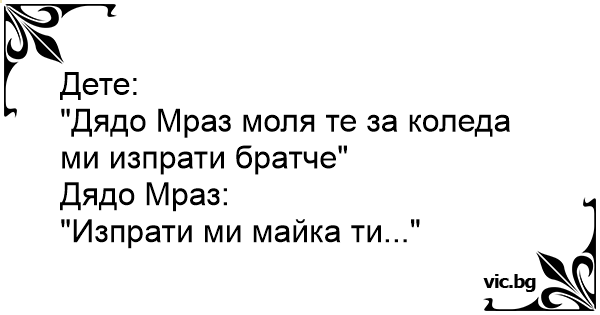 Му пишало некое дете на Дедо Мраз „Дедо Мраз те молам прати ми сестричка". Дедо Мраз му пишал "Ок, прати ја мајка ти"