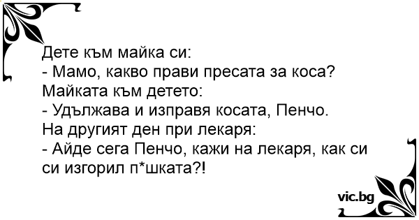 - Айде сега Пенчо, кажи на лекаря, как си си изгорил пишkata?!