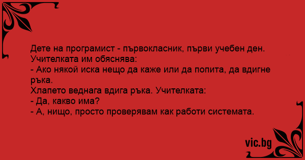 Хлапето веднага вдига ръка. Учителката: