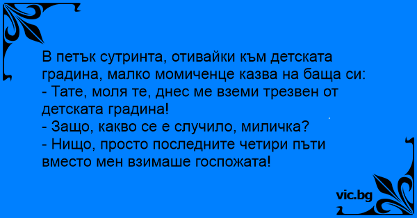 Во петок сабајле, за време на патот кон градинката малиот Трпе му вика на татко си: - Тато, може ли денеска да дојдеш да ме земеш трезен? - Зошто синко? - Епа последните четири пати наместо мене ја...