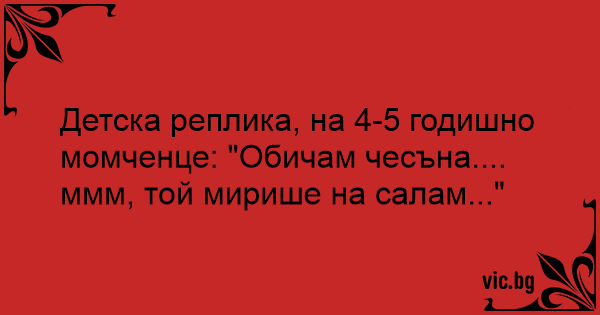 Детска реплика, на 4-5 годишно момченце: "Обичам чесъна.... ммм, той мирише на салам..."