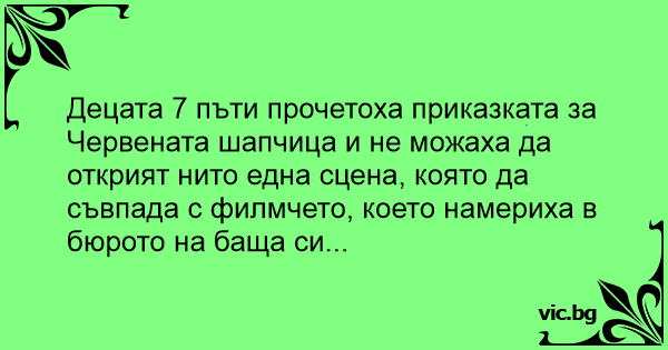 Децата 7 пъти прочетоха приказката за Червената шапчица и не можаха да открият нито една сцена, която да съвпада с филмчето, което намериха в бюрото на баща си...