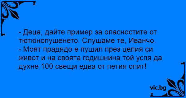 - Деца, дайте пример за опасностите от тютюнопушенето. Слушаме те, Иванчо.