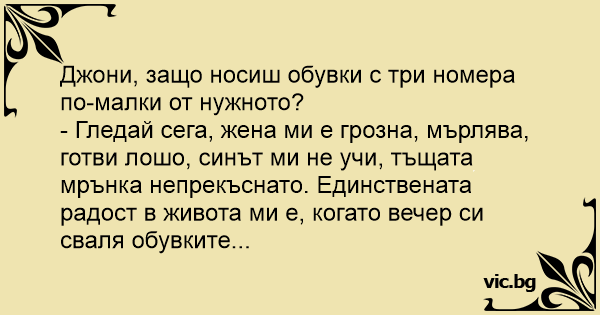 - Гледай сега, жена ми е грозна, мърлява, готви лошо, синът ми не учи, тъщата мрънка непрекъснато. Единствената радост в живота ми е, когато вечер си сваля обувките...